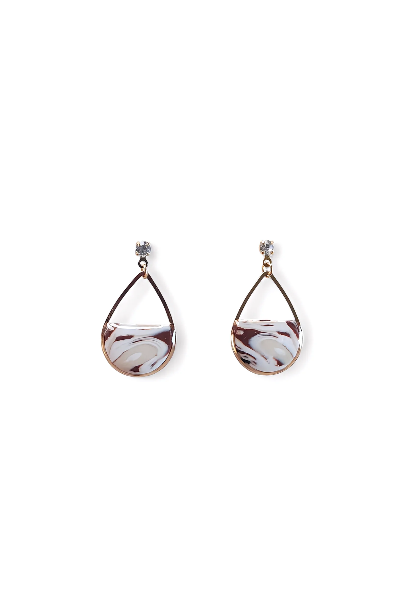 Boucles d’oreilles en argile polymère, en forme de goutte, ornées d’un motif marbré brun et blanc aux reflets doux et boisés. La goutte est insérée dans une monture en acier inoxydable, et l’ensemble est monté sur clous en plaqué or 18k sertis d’un zircon scintillant. Une pièce élégante et raffinée qui se porte en toute occasion.