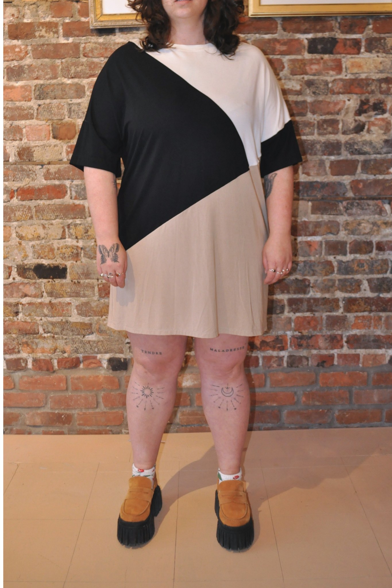 Robe ample style t-shirt à encolure ronde, manches courtes. Emmanchure descendue. Longueur mi-cuisse. Bloc de couleurs contrastants.