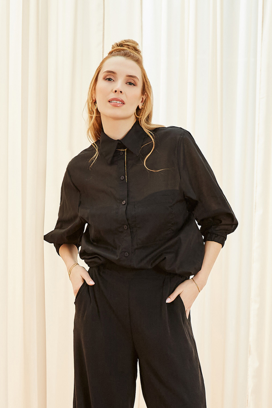 Pensée pour les soirs de fête, la chemise LIS en voile noir dévoile juste ce qu’il faut. Une pièce subtile et sophistiquée de notre capsule Holiday pour une allure rehaussée.