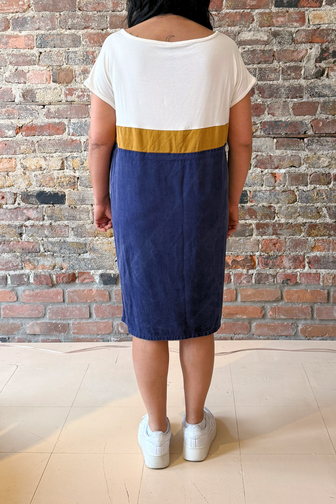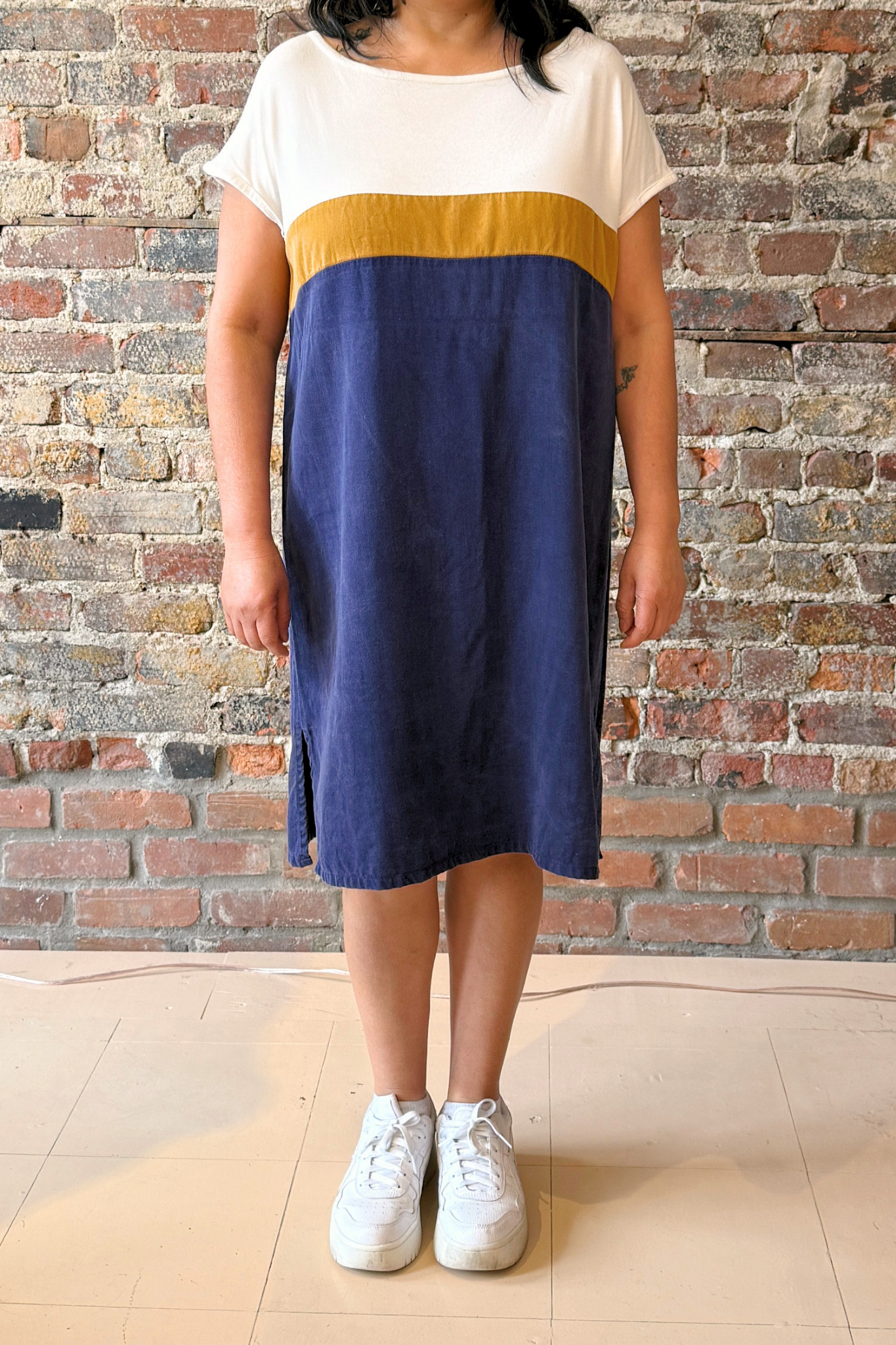 Robe droite tricolore fendue sur le côté à manches courtes