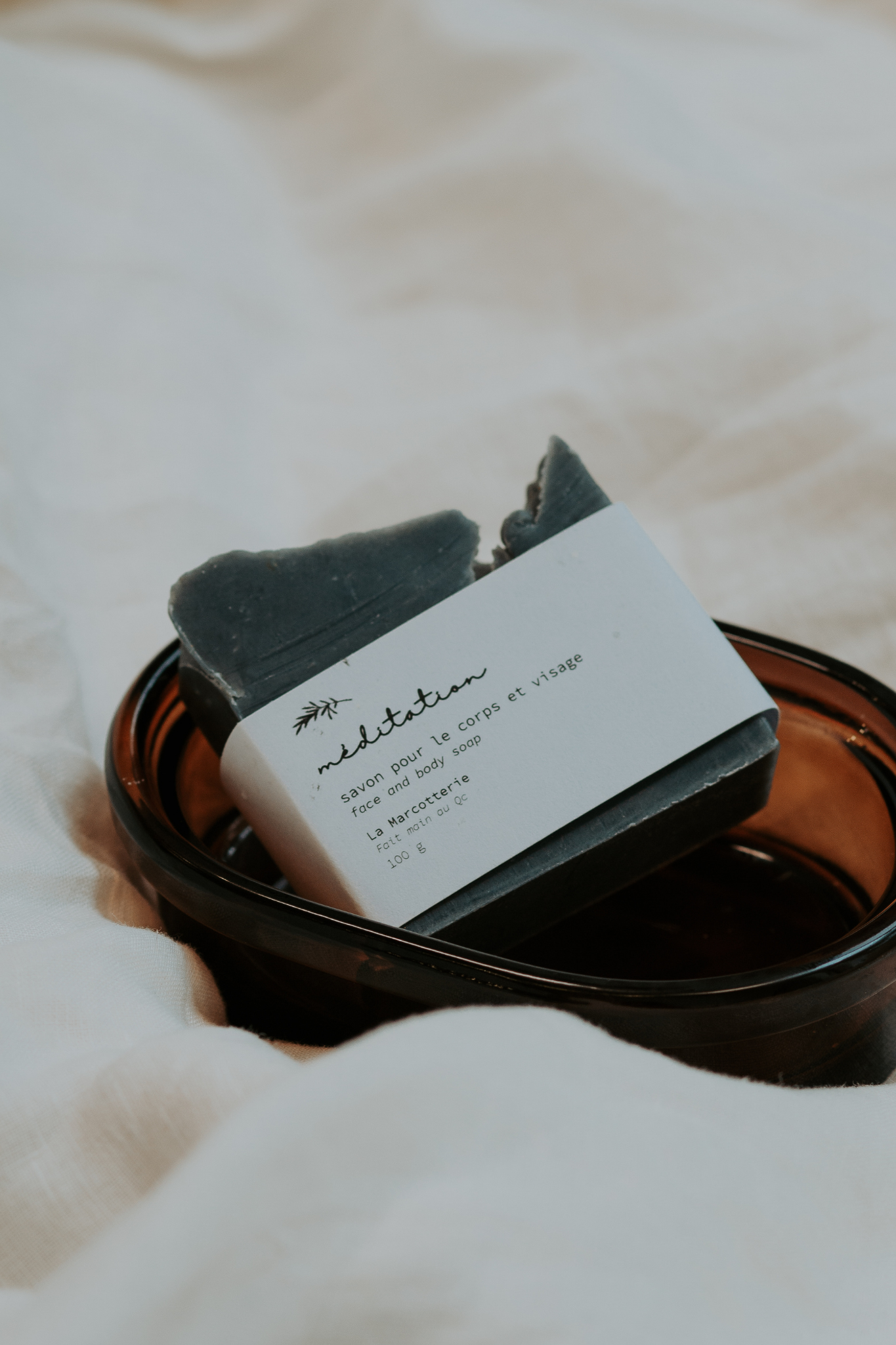 Détoxifier votre peau avec le savon artisanal Méditation. Ce mélange spécial contient du charbon activé, des huiles essentielles de bois de Ho, lavande, d'eucalyptus et de bois de cèdre, offrant une expérience purifiante pour votre peau. Convient à tous les types de peau, y compris les peaux sensibles, notre savon contient des ingrédients 100 % naturels