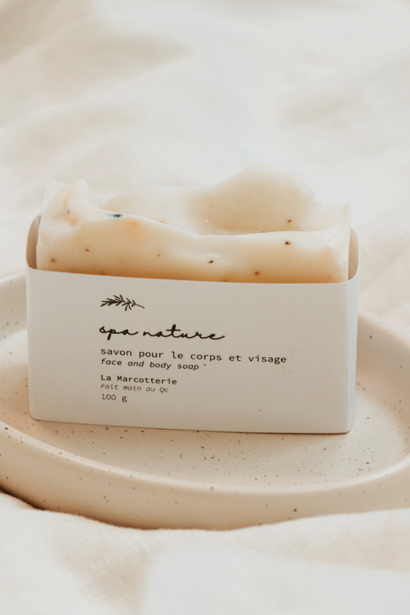 POn vous présente le savon Spa Nature – un parfum frais et herbacé à base d'huiles essentielles de marjoram, menthe poivrée et d'eucalyptus. Naturel et rafraîchissant, c'est le choix parfait pour votre quotidien. Adapté à tous les types de peau, y compris les peaux sensibles, notre savon contient des ingrédients 100% naturels.