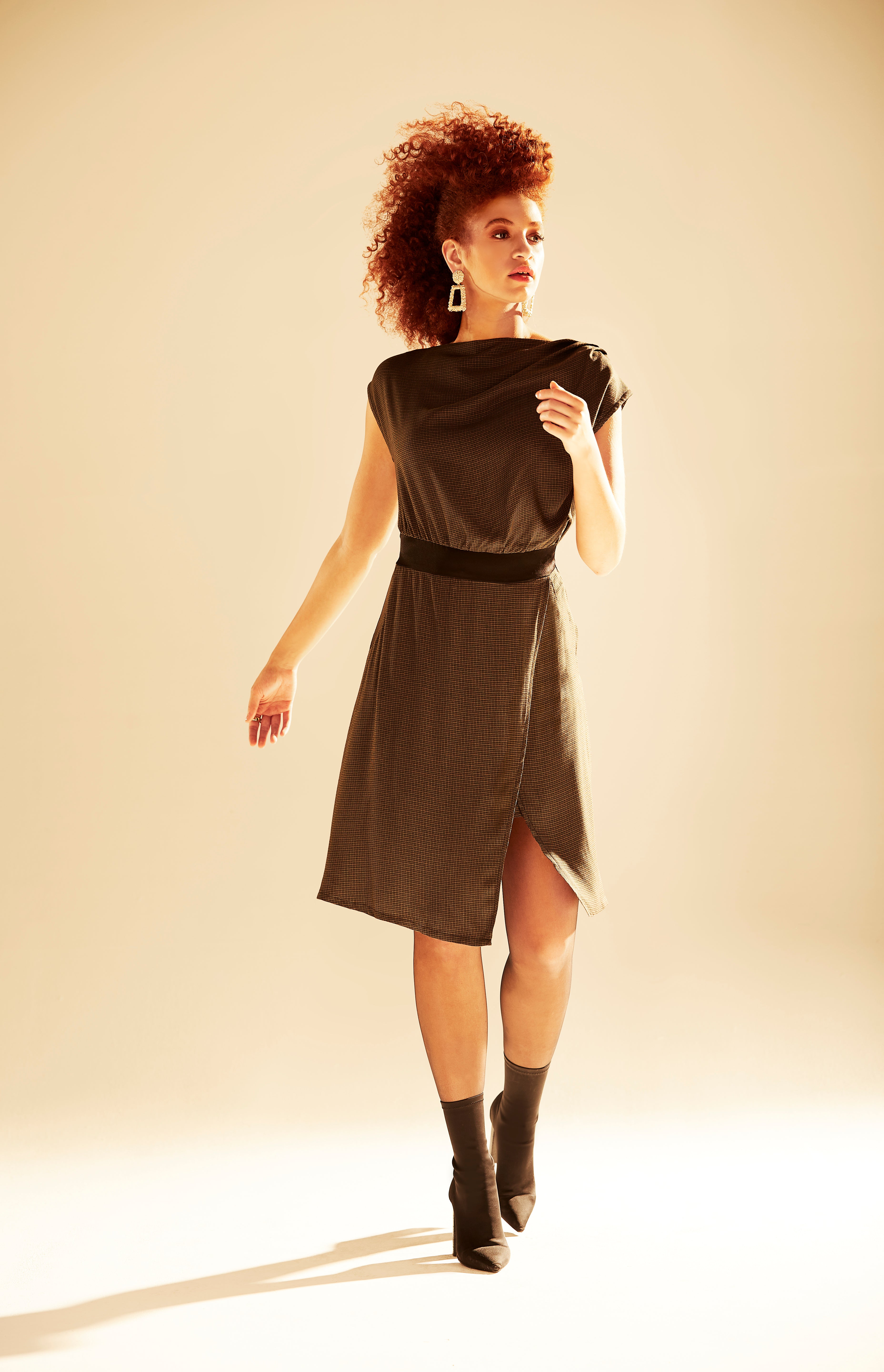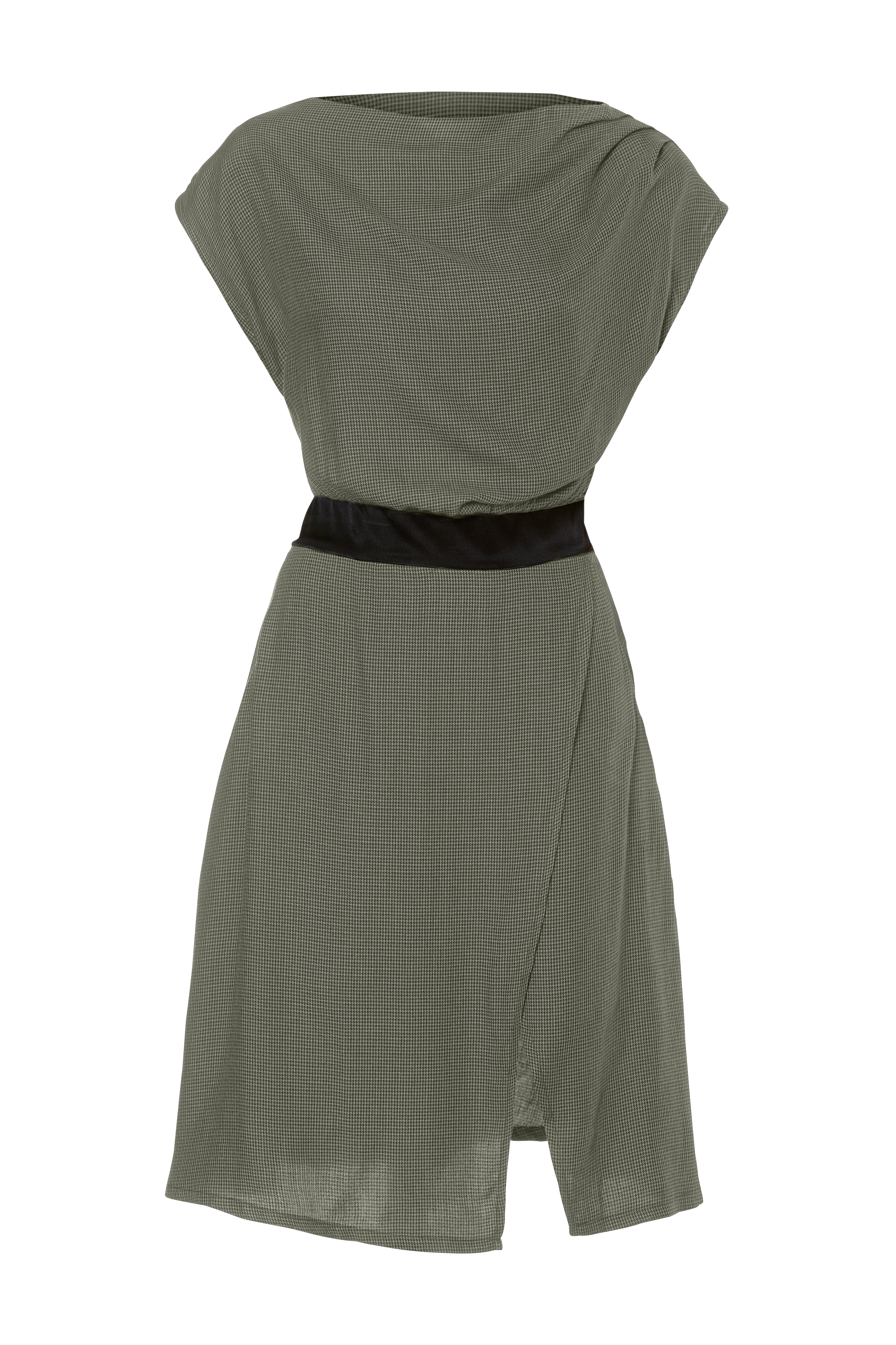 Une robe au drapé délicat qui souligne la silhouette avec modernité. Son corsage souple au col légèrement tombant contraste avec une taille définie et une jupe asymétrique fendue qui apporte mouvement et allure. Facile à porter, raffinée sans effort, elle crée une ligne fluide et assumée.