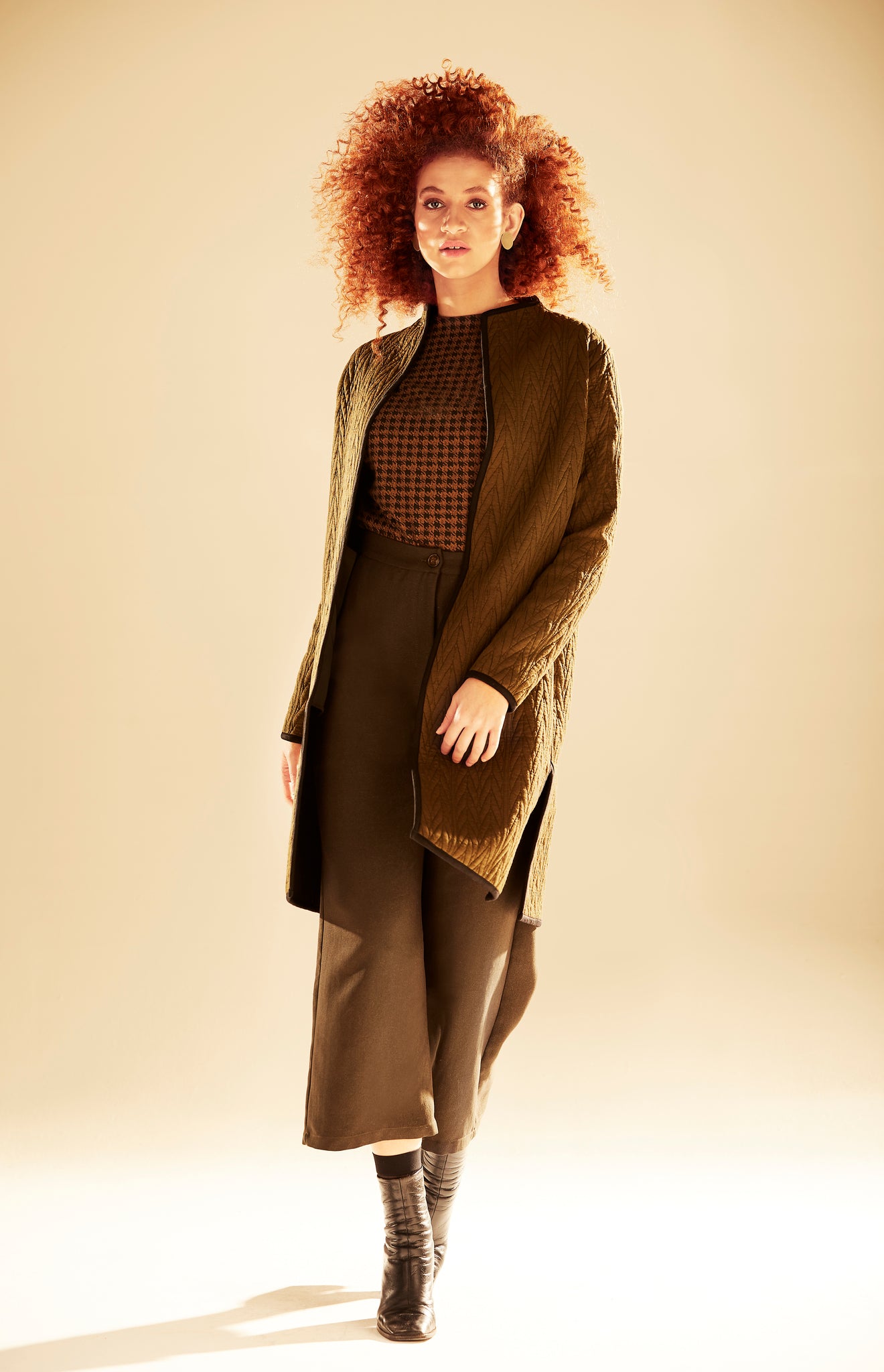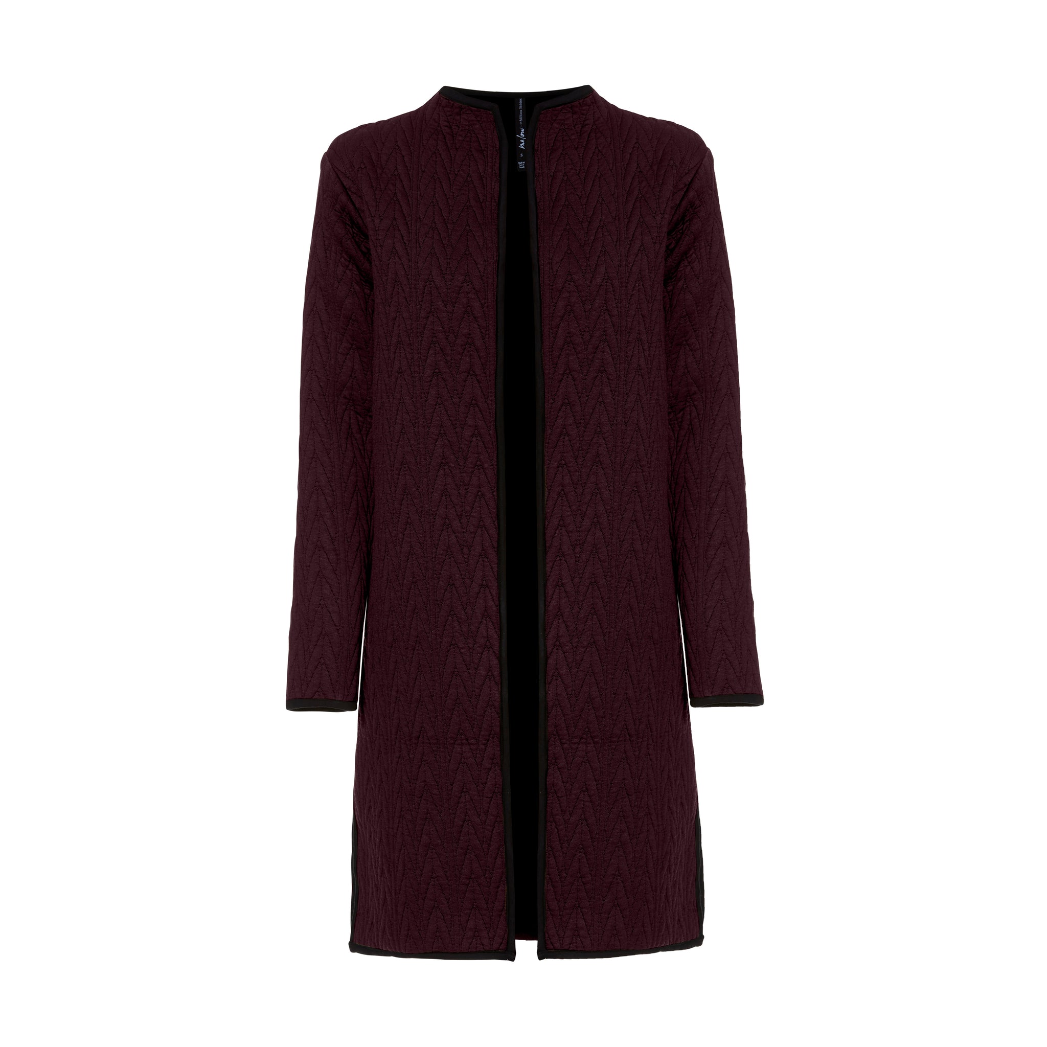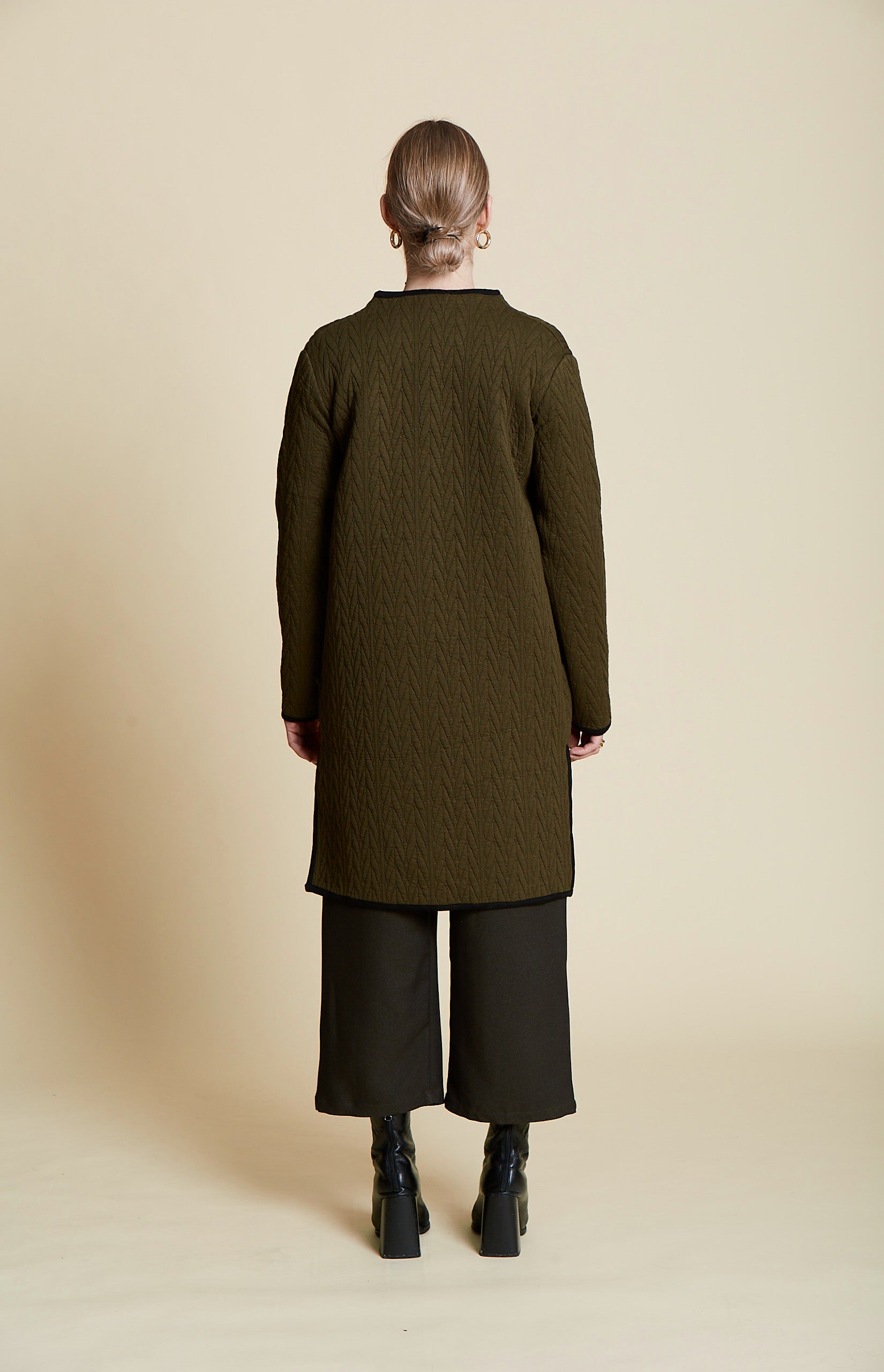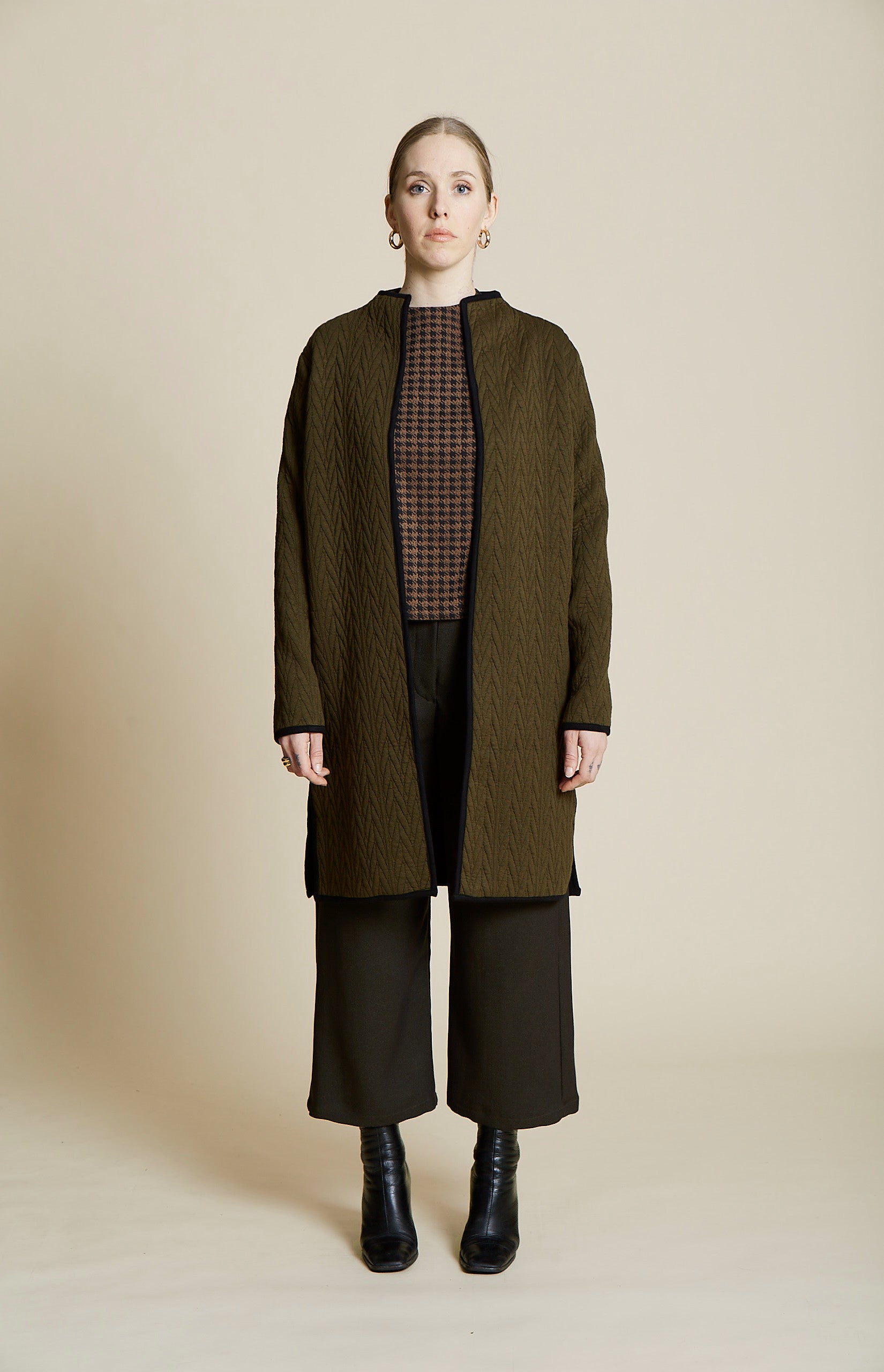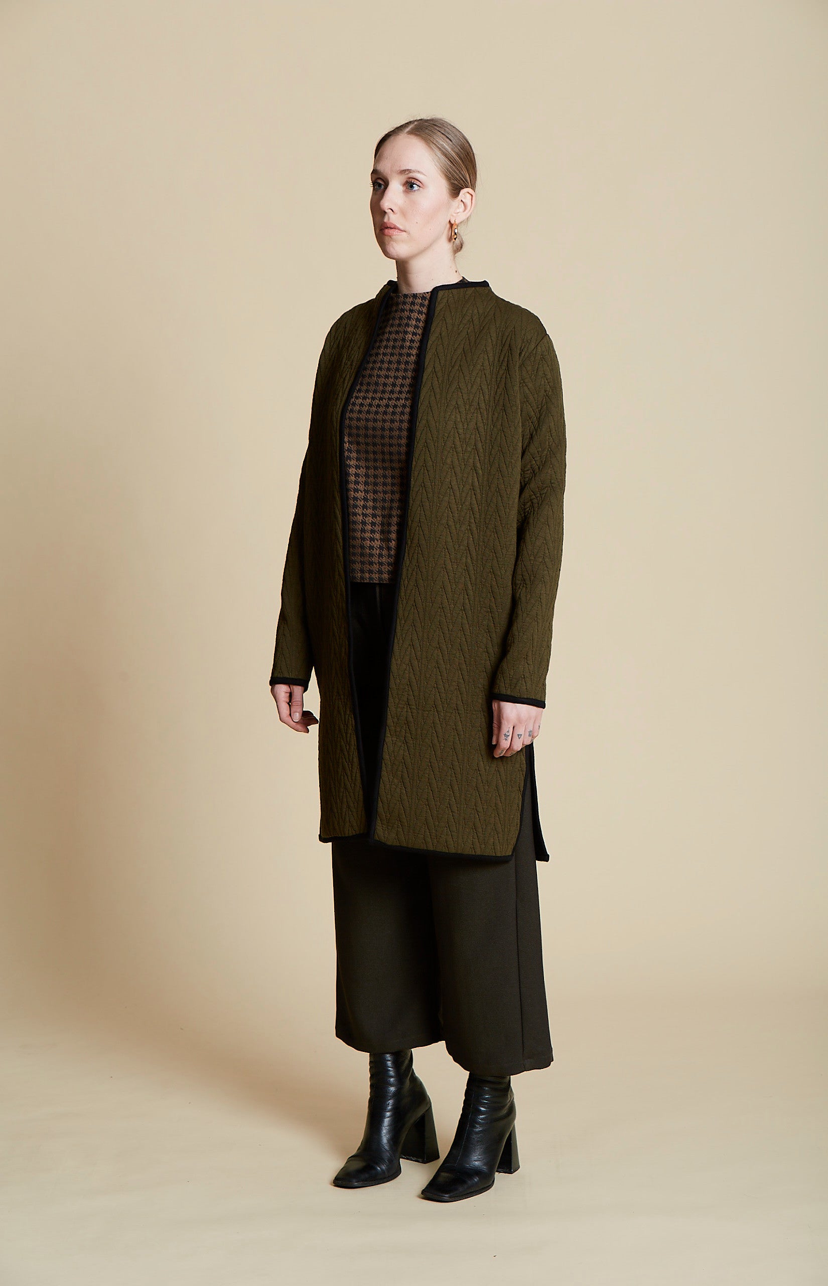 Cardigan longueur mi-cuisses, ouvert à l’avant avec fentes de chaque côté. Finition en biais noir.