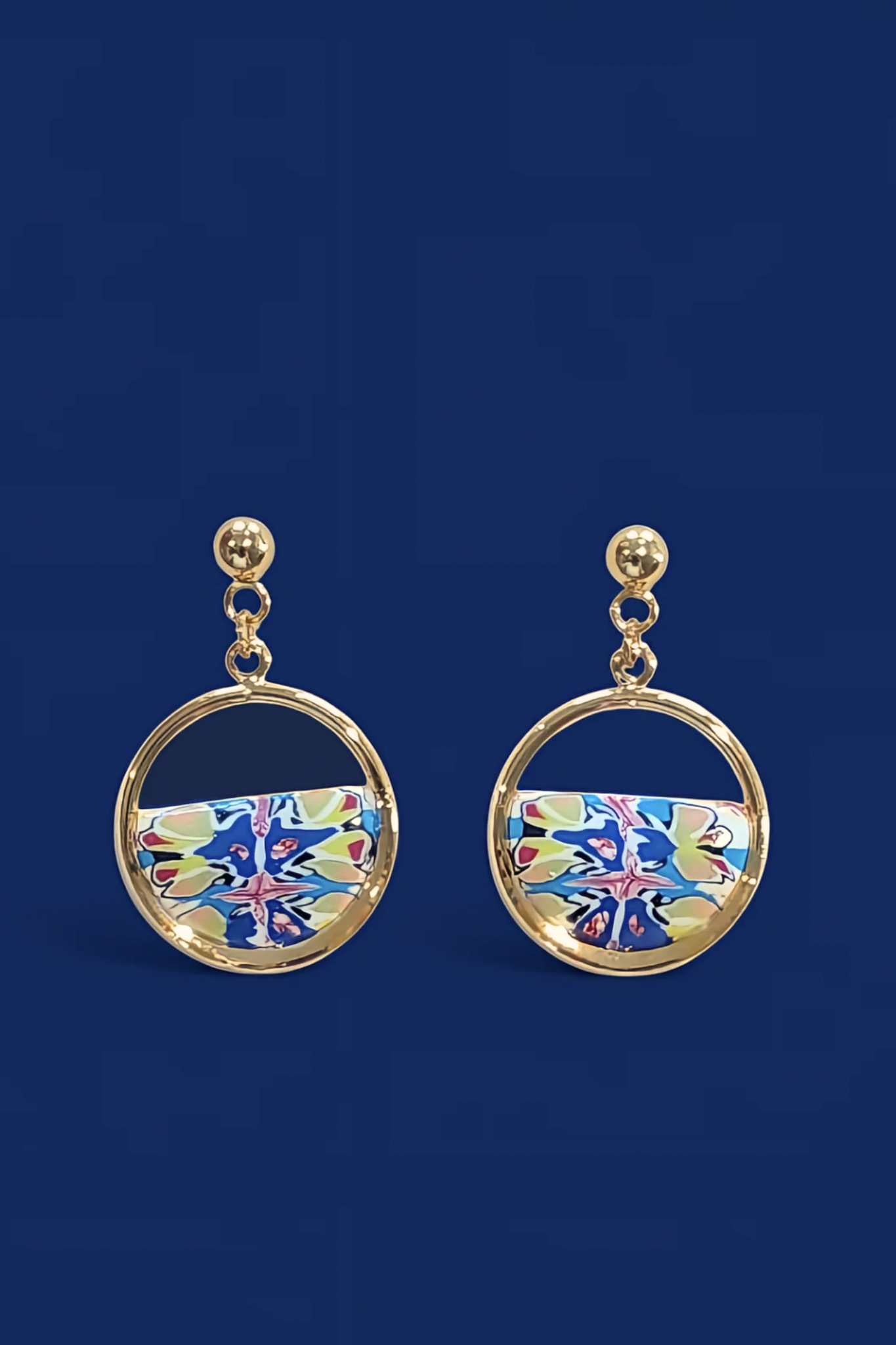 Boucles d’oreilles rondes en argile polymère, ornées d’un motif floral symétrique aux teintes bleu nuit, rose fuchsia, vert tendre et ivoire. Encadrées d’un anneau plaqué or 18k élégant et montées sur clous dorés en acier inoxydable hypoallergénique, elles allient éclat, légèreté et originalité.
