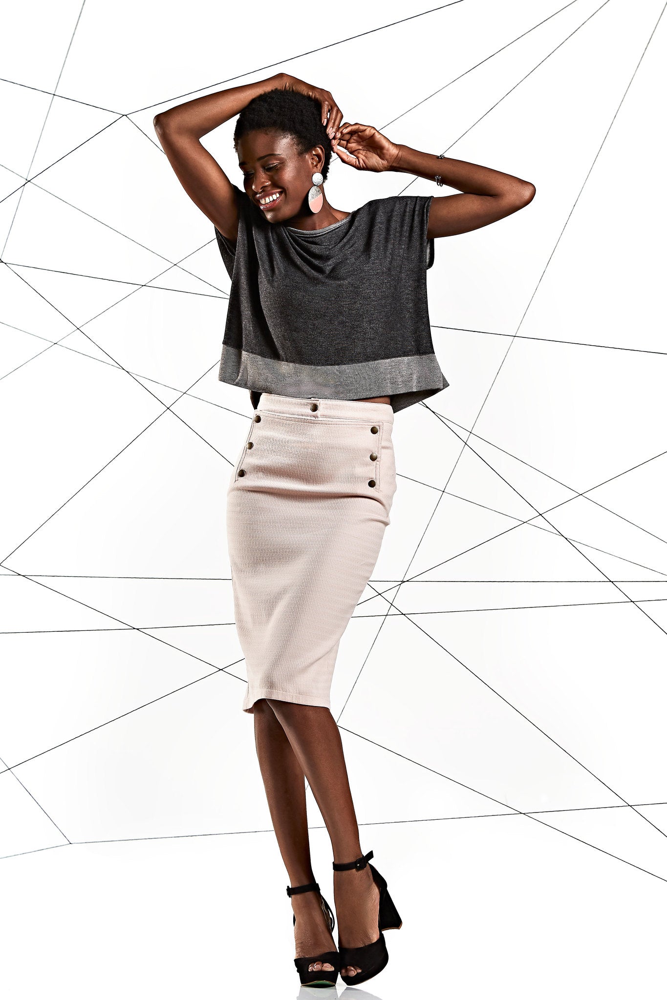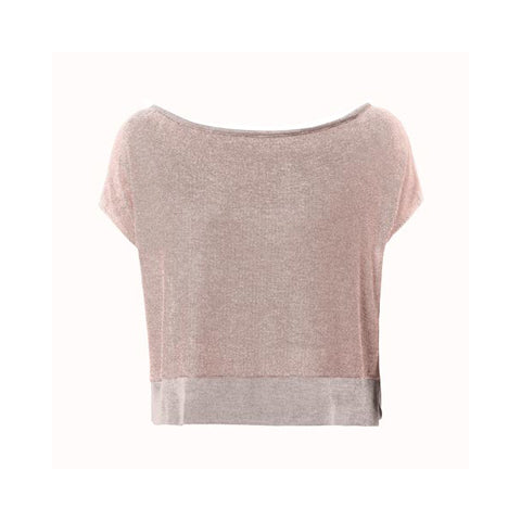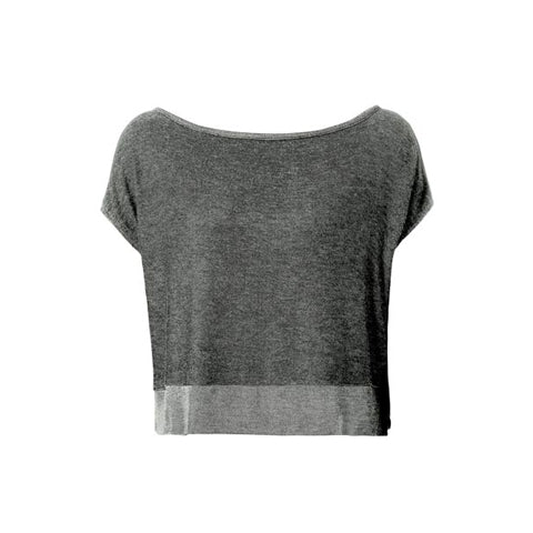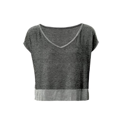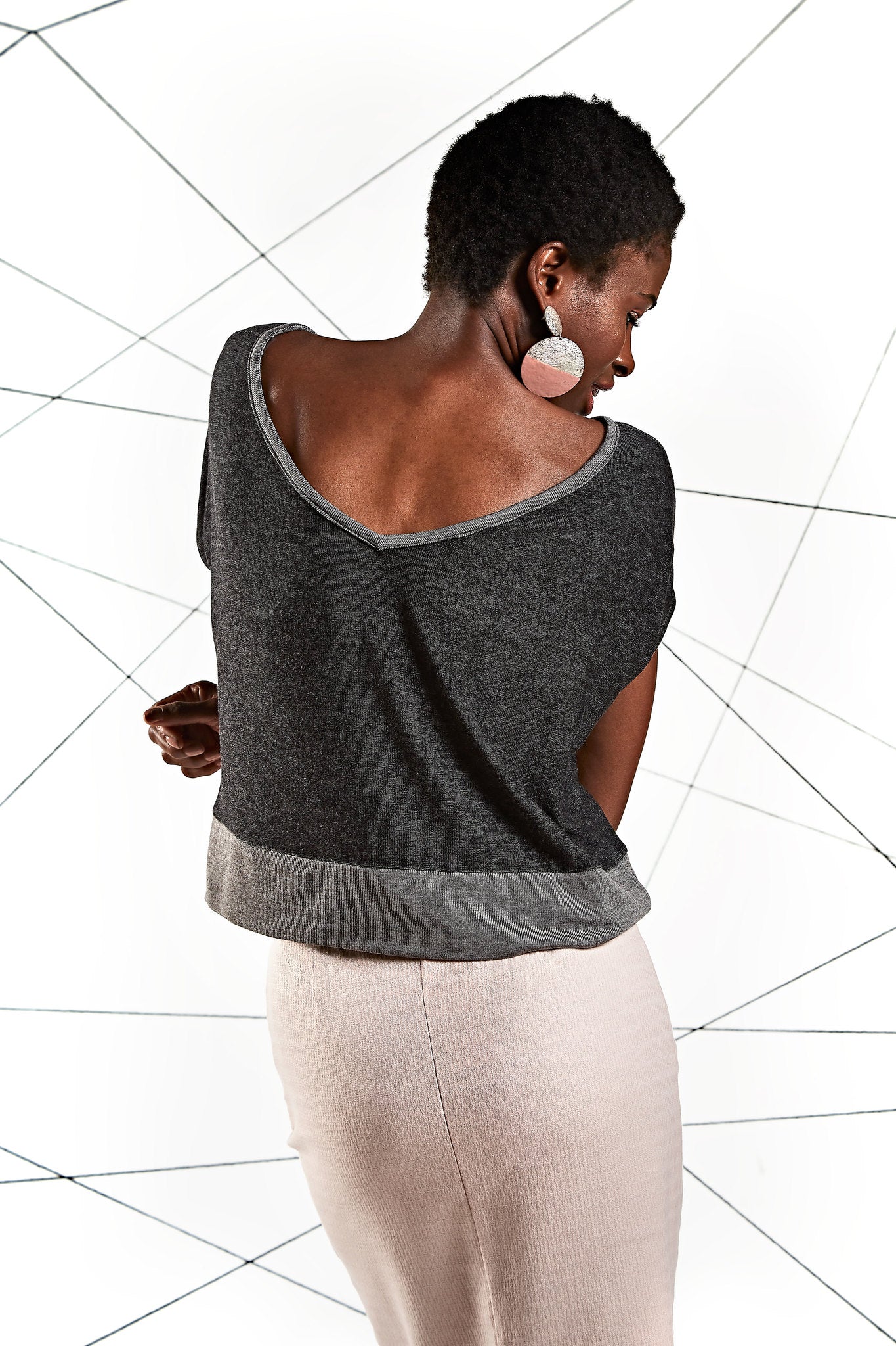 Reversible loose cropped top with a V-neck, unmounted short sleeves and slits at the lateral seams. There is a contrast play with the back of the fabric at the neckline and the hem.
