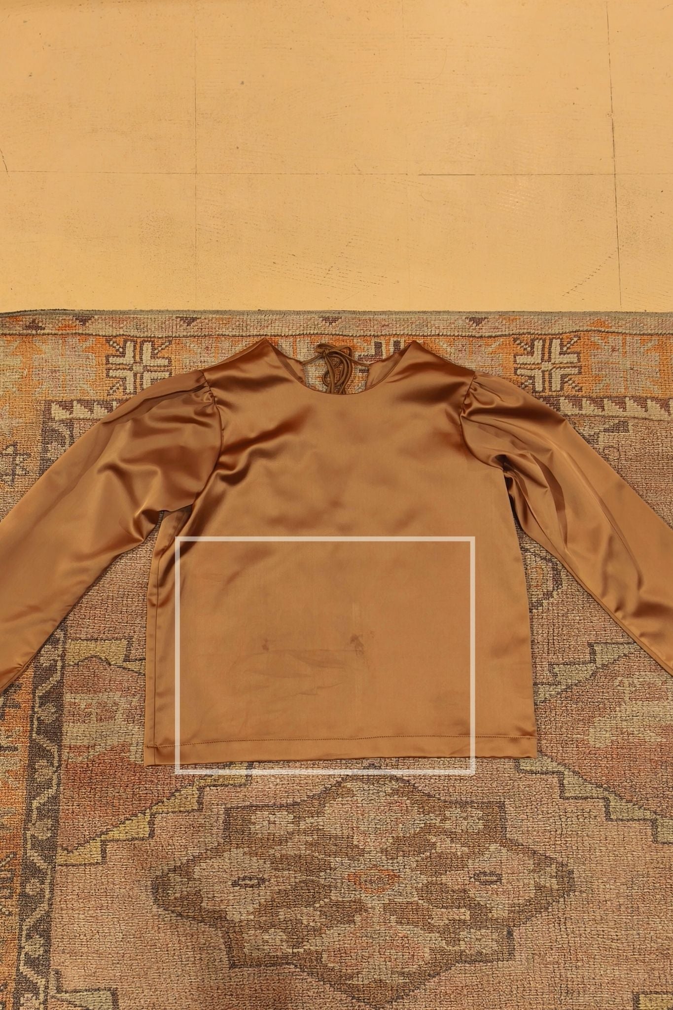 Straight top, round neckline. Long sleeves, shirt-style finish. Pleated sleeve heads with a "puffed" effect. V-neck back and drawstring closure.
