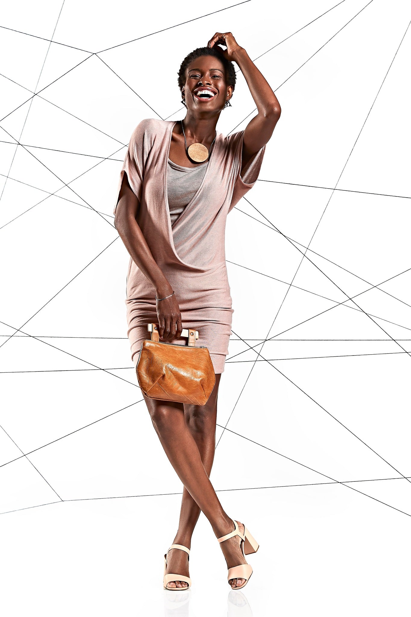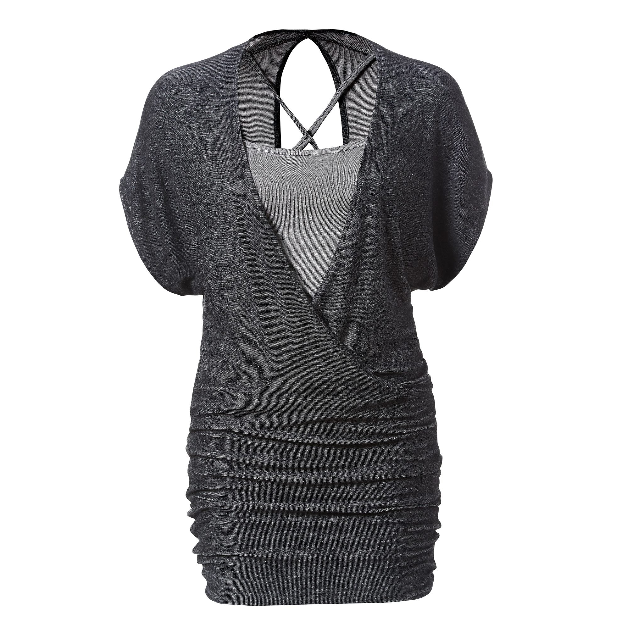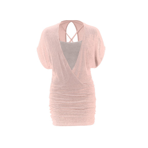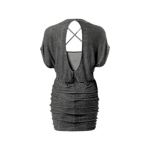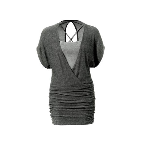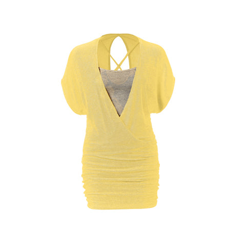 Dress with integrated camisole (contrast play with the back of the fabric) with unmounted loose drop sleeves. The bodice, wrap-over top style, has a draped plunging neck and an opened back. The mid-thigh length skirt is adjusted with a pleated effect at the lateral seams.