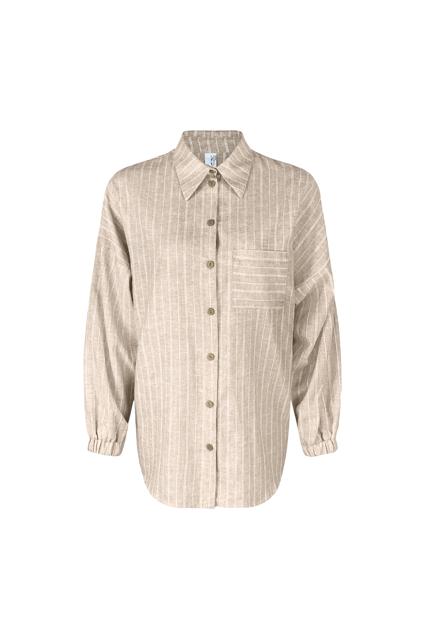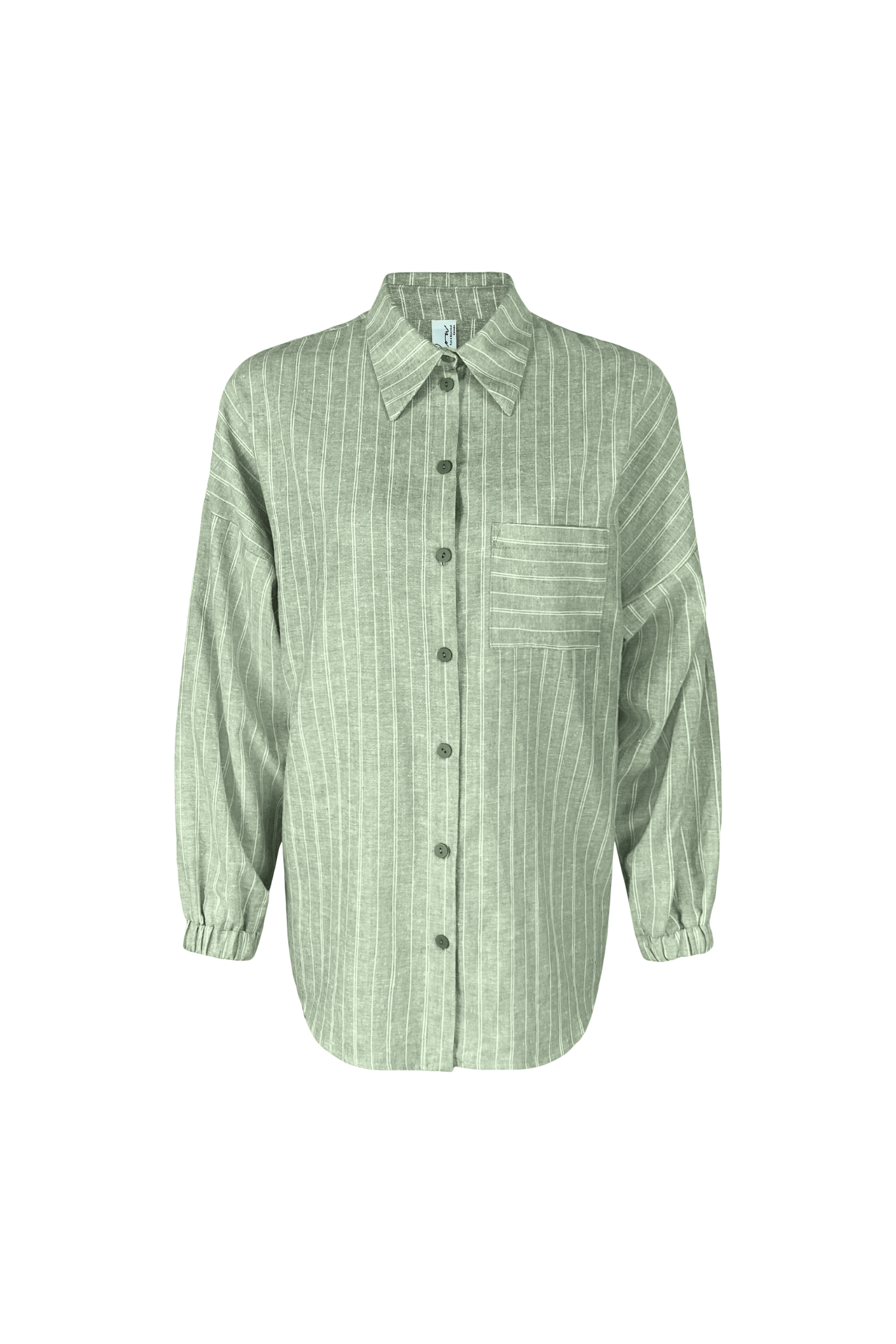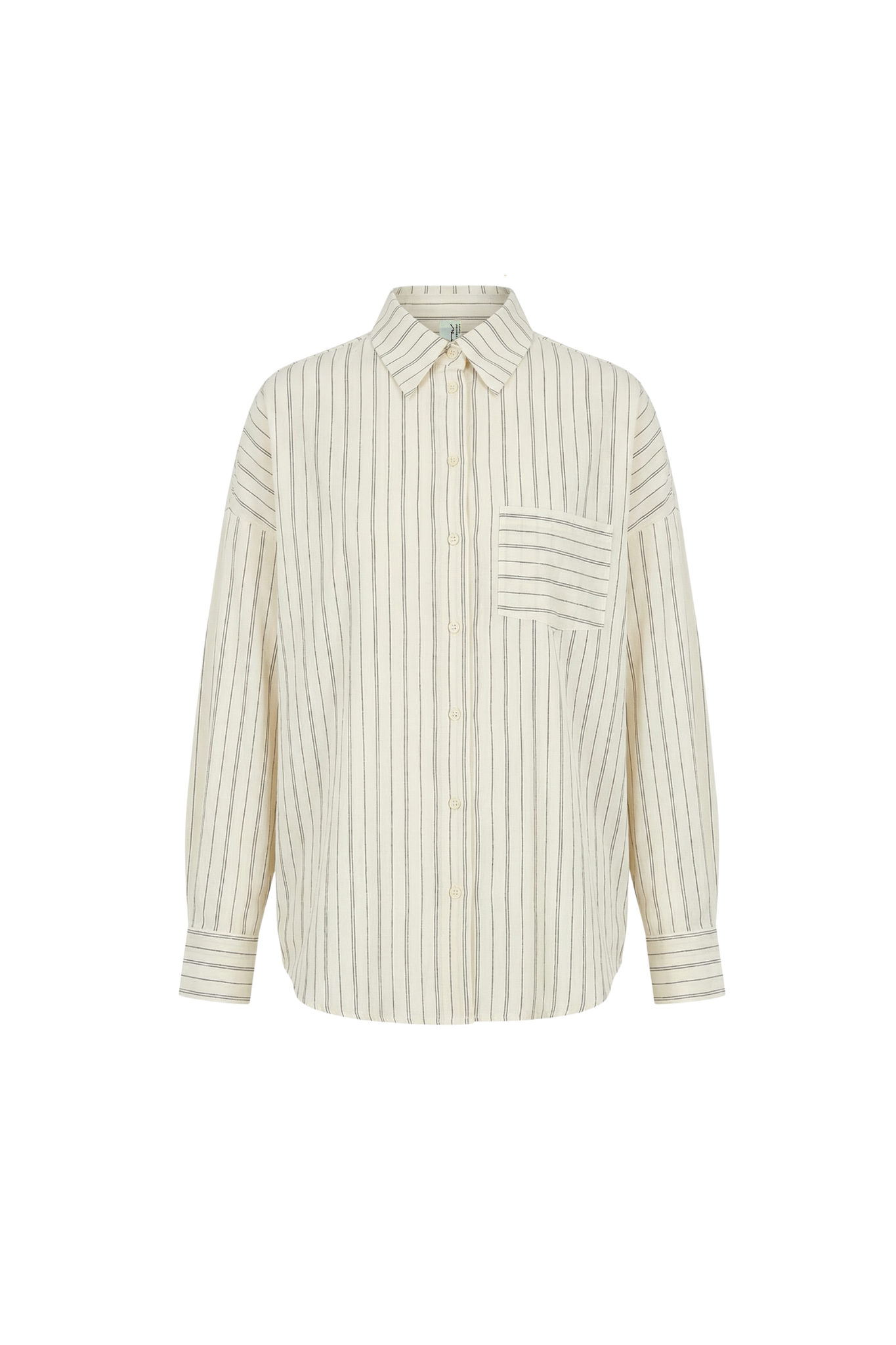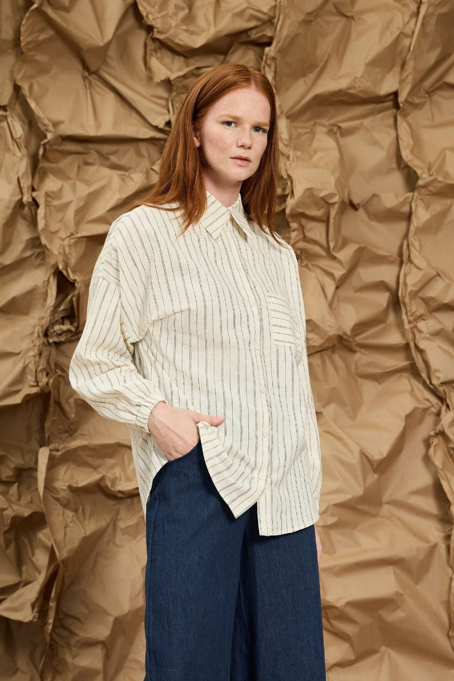 La coupe ample et le motif linéaire de la chemise MARILOU nous rappellent les temps chauds de l’été.